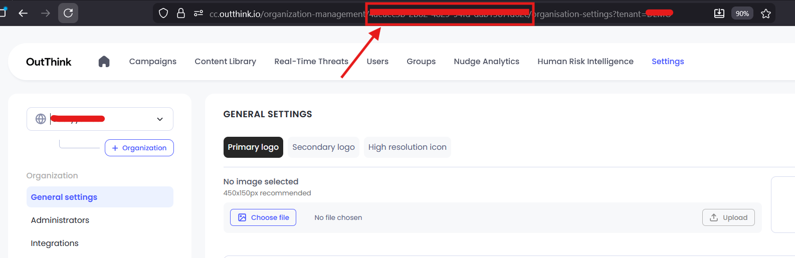 - In the flyout that appears, enter the text that represents your unique OutThink Customer Id/Organization ID (multi-org). This is a 32-character identifier and can be obtained via the Settings section in the OutThink Command Center: Click on the appropriate Org (from dropdown if multi-org) >Copy the GUID from the URL (highlighted with an arrow in the screenshot below)